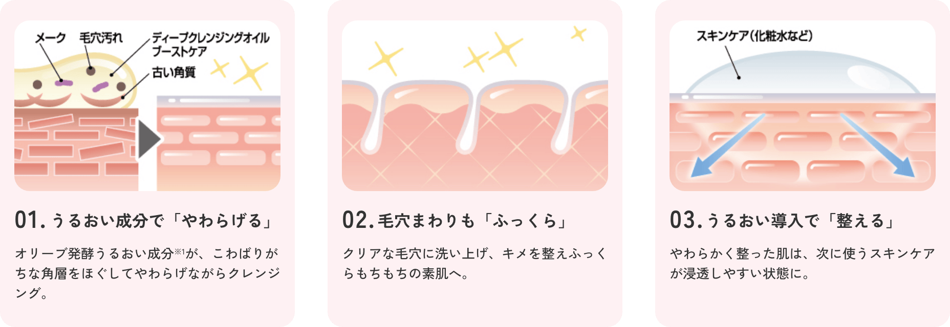 DHCこだわりの「オリーブ発酵うるおい成分※1」を配合したもっちりとろみオイルが、こわばりがちな角層にもなじみ、潤いで柔らかくほぐすことで、次に使うスキンケアの浸透を促します。