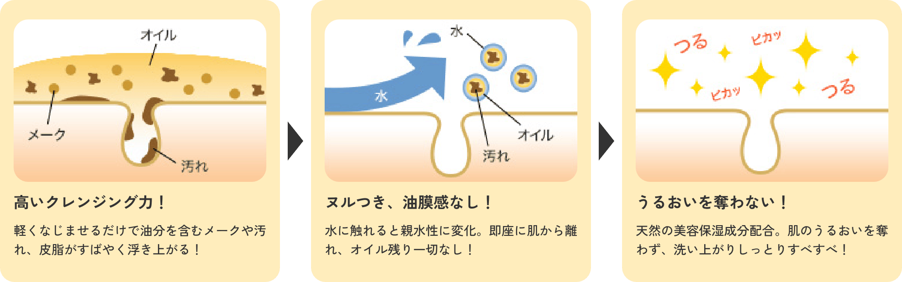 4種の植物美容オイル※2がウォータープルーフなどの落としにくいメークはもちろん、古い角質や角栓もふやかして除去!濡れた手でもしっかりとメークを落としつつ、5種の美容保湿成分配合※3で洗いあがりもつっぱらず、ふっくらとしたすべすべ肌に導きます。