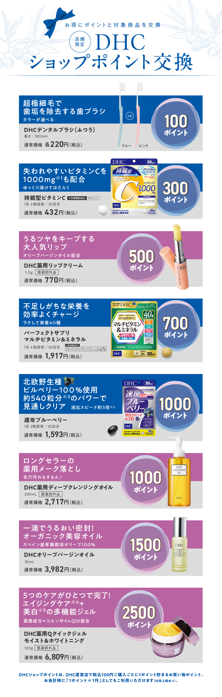 - ●DHCショップポイントは、DHC直営店のみでご利用いただけます。DHCネットポイントとはサービスが異なります。